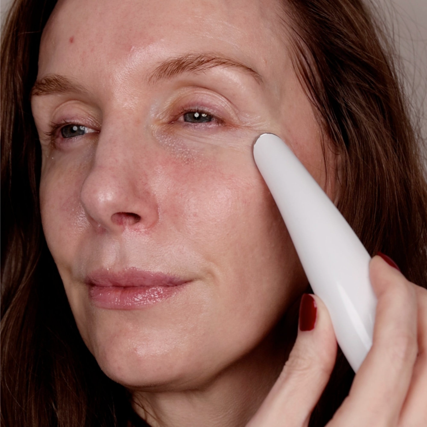 2) The Wand needs ‘slip’ to help it glide effectively. Gently pat a pea-sized amount of our Soothing Coconut Eye Balm (or your favourite under eye cream or serum) around your eye area using a clean finger or one of our Reusable Velvet Bamboo Pads.